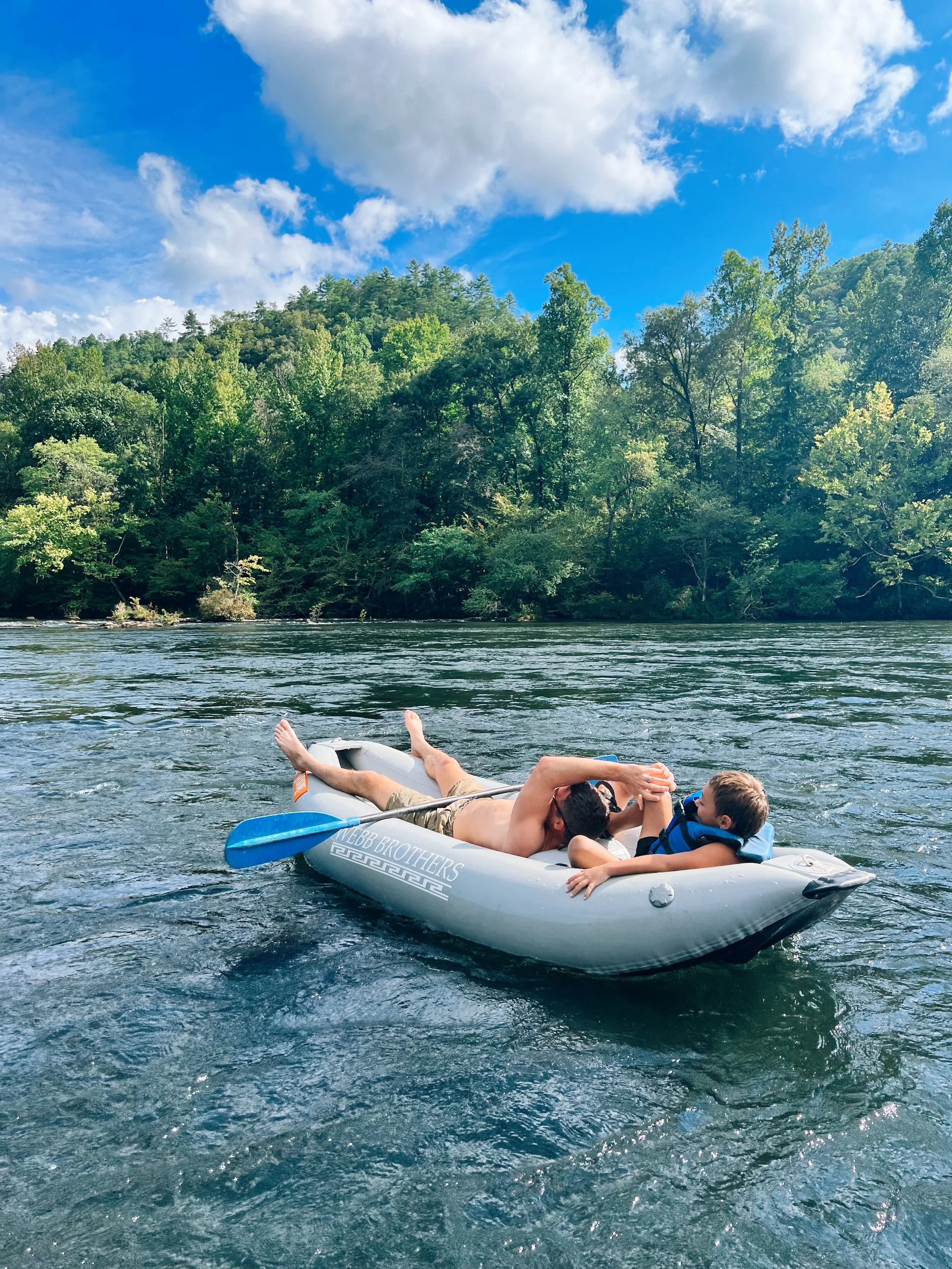 So Saturday, as we were relaxing under the magnolia tree, he comes back from the farm and suggests we all go rafting down the river. And weirdly, even though it would require some work getting there, that sounded like a great idea. We could all float down the river, a rather easy thing to do, while also having fun “doing” something. It was the best of both worlds and it was the most fun way to spend a Saturday. PJ got to relax and do something at the same time. Plus, the kids had a blast.