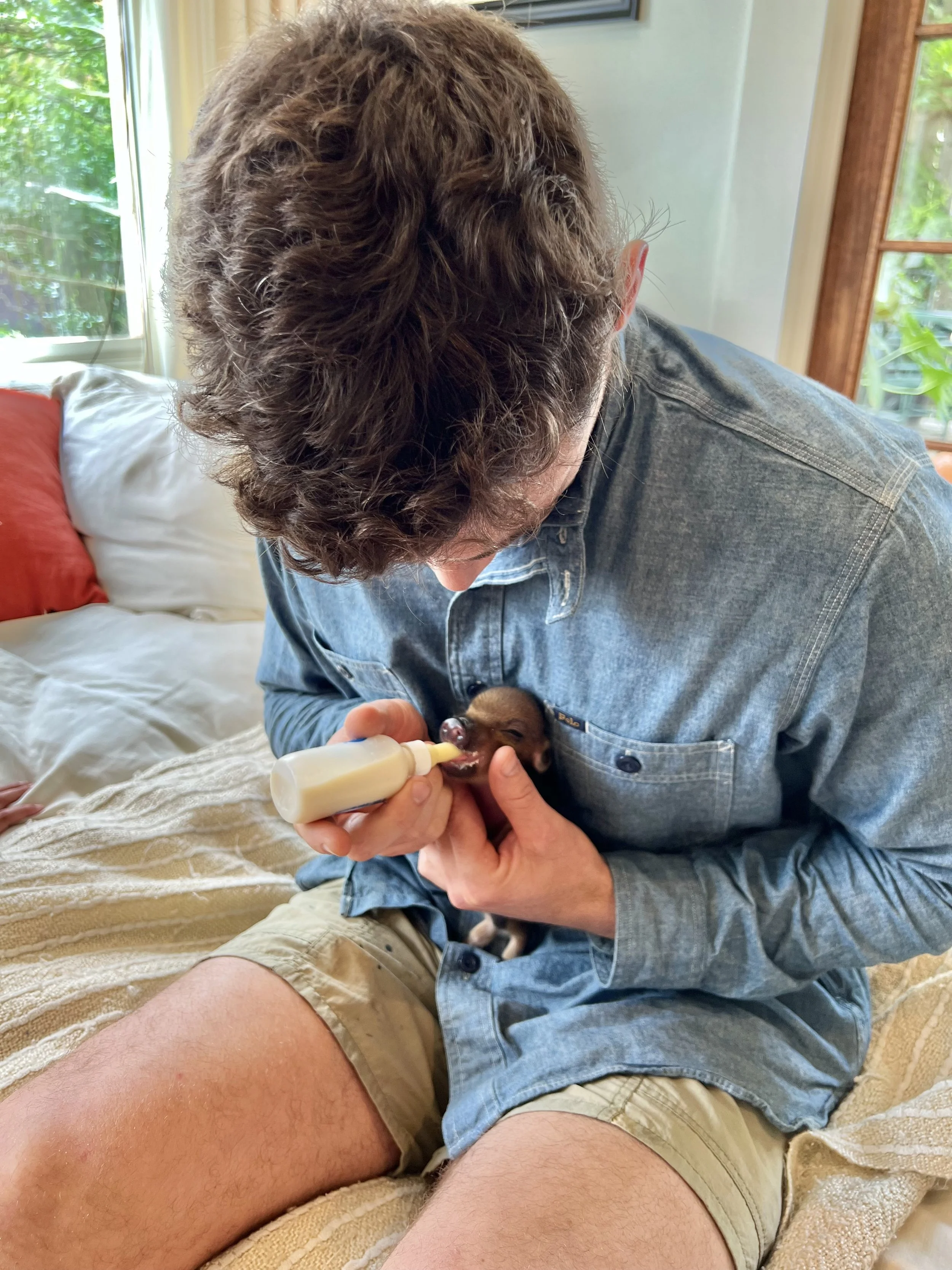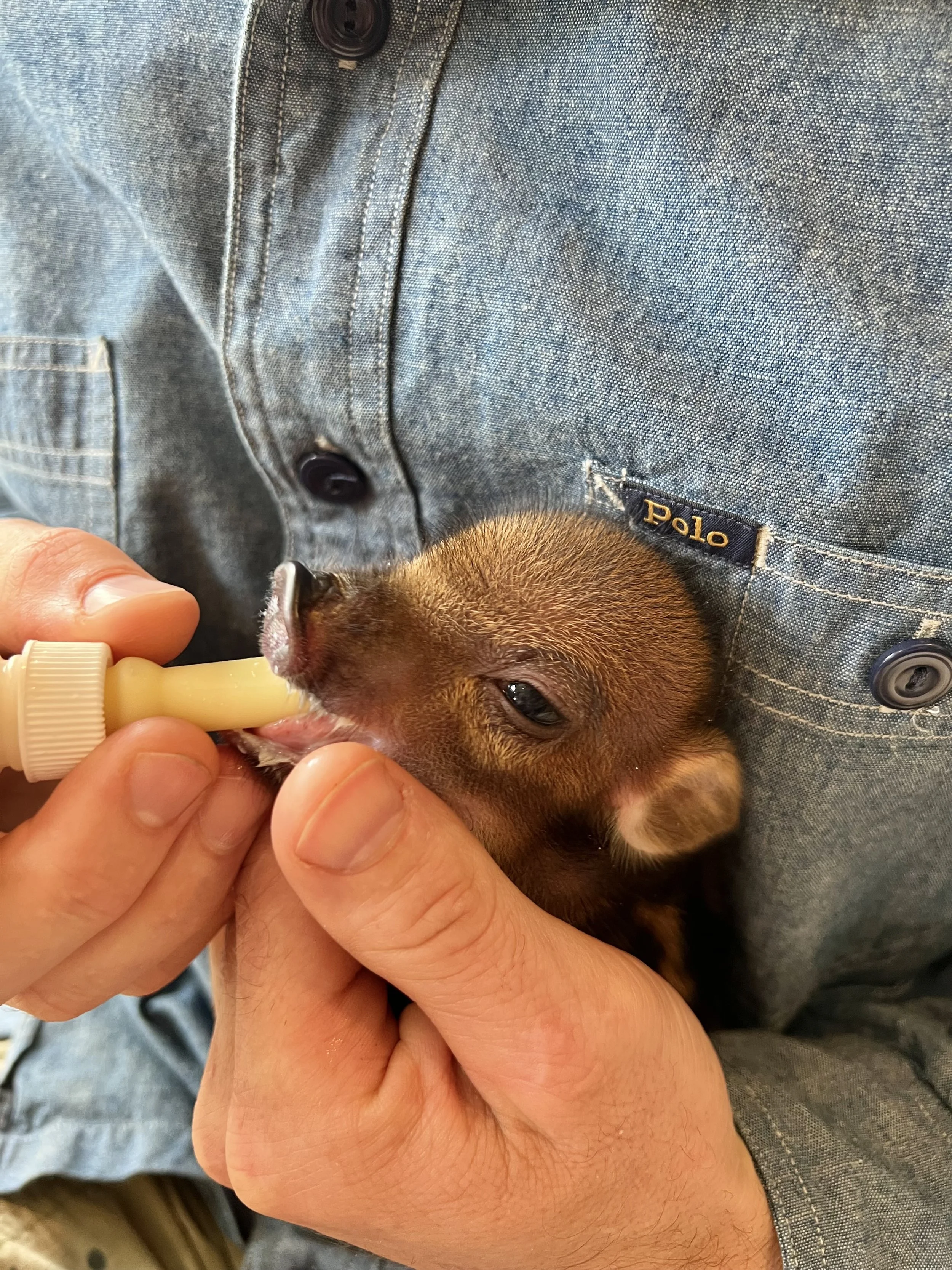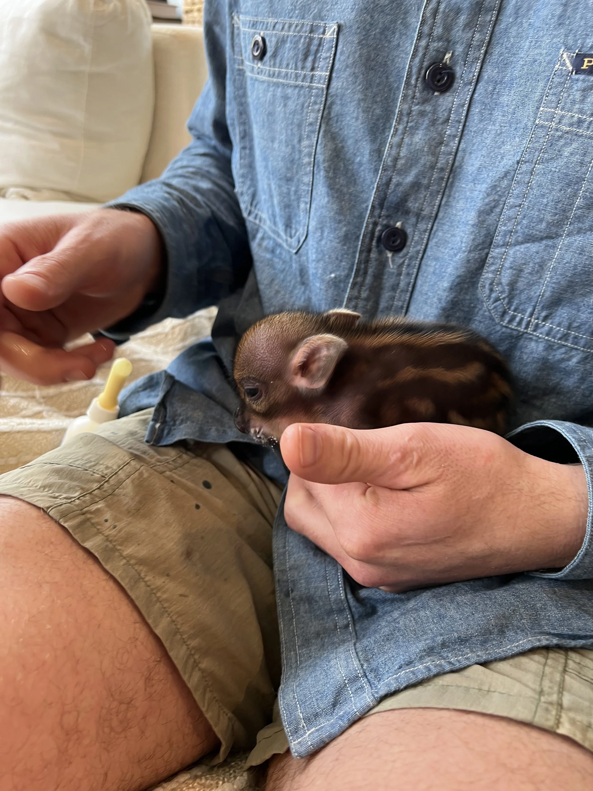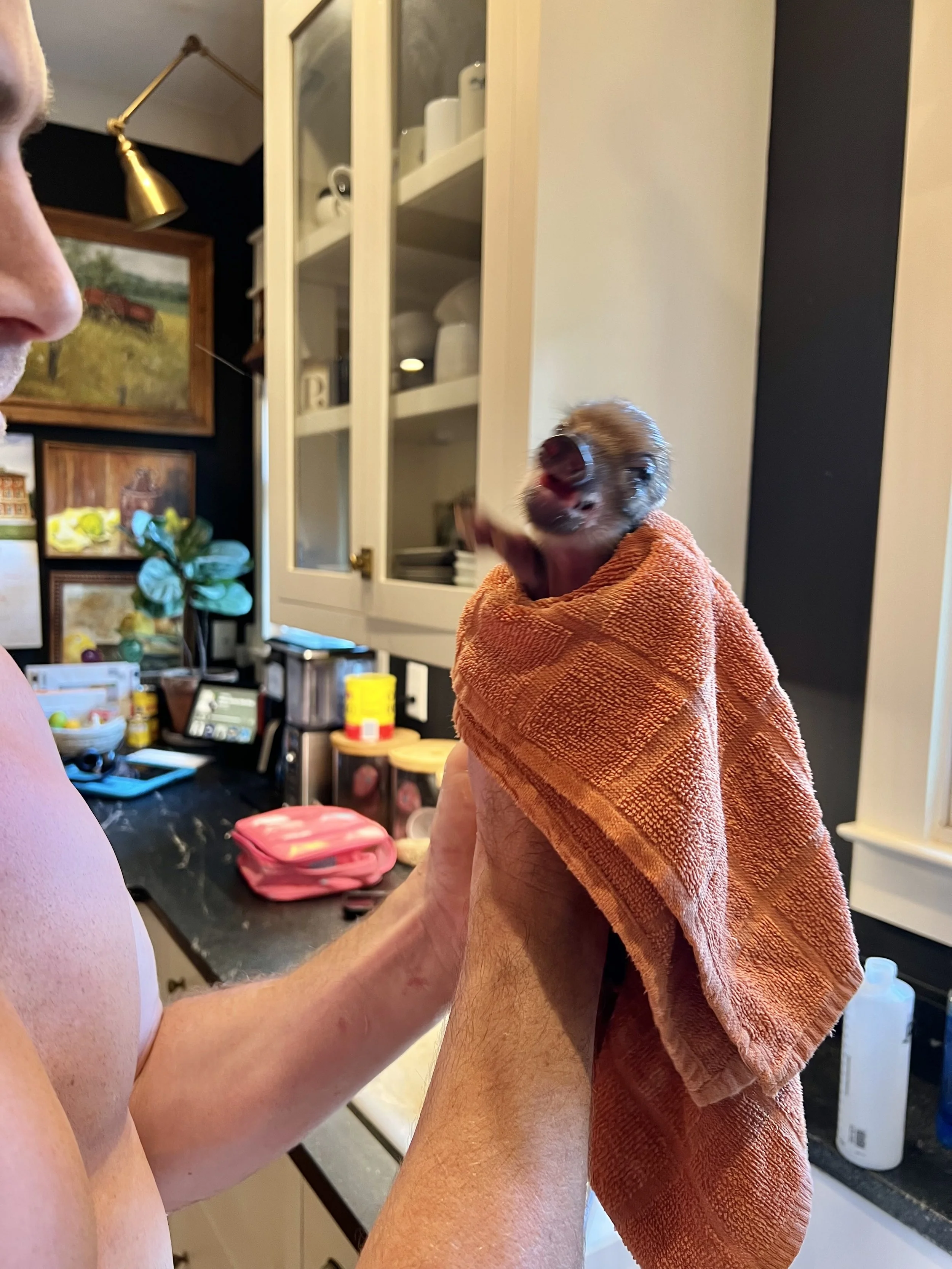 Piggerton has been staying at our house in town for the last two days and we’ve all taken turns bottle feeding her and cuddling her tight. PJ fell asleep on the couch today with her wrapped up in his arms and it was the cutest damn thing you’ve ever seen. I’m kicking myself for not taking a picture of it, but here’s a picture of her right after PJ gave her a bath in the sink that will have to suffice instead.