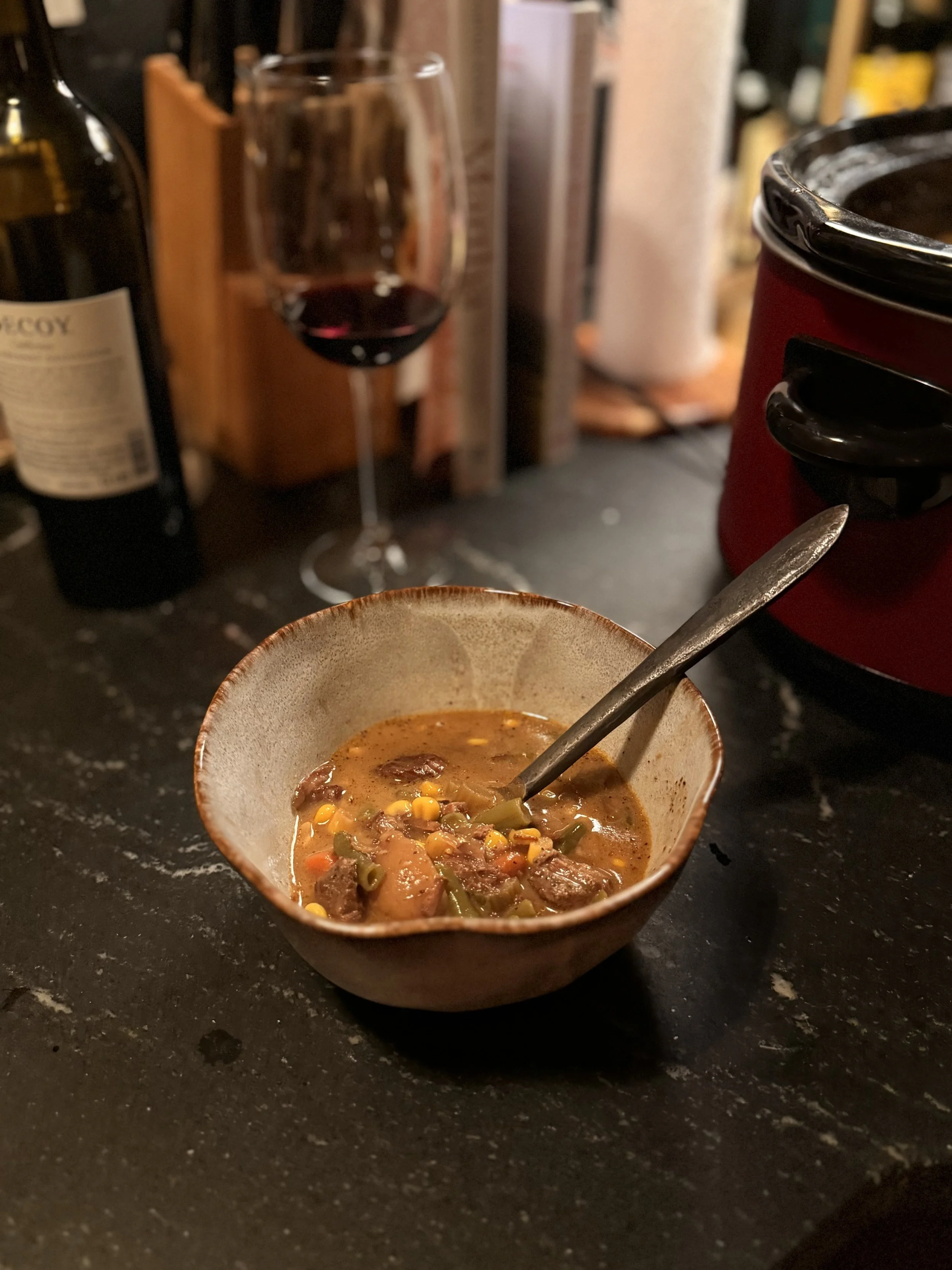 This slow cooker beef stew with red wine is packed with tender chunks of beef, baby potatoes, sweet corn, green beans, carrots, and peas, and all cooked low and slow in a creamy, flavorful broth that gets its depth from a splash of good red wine. It’s one of those easy family dinners that makes enough to feed a crowd with plenty of leftovers for the next day.