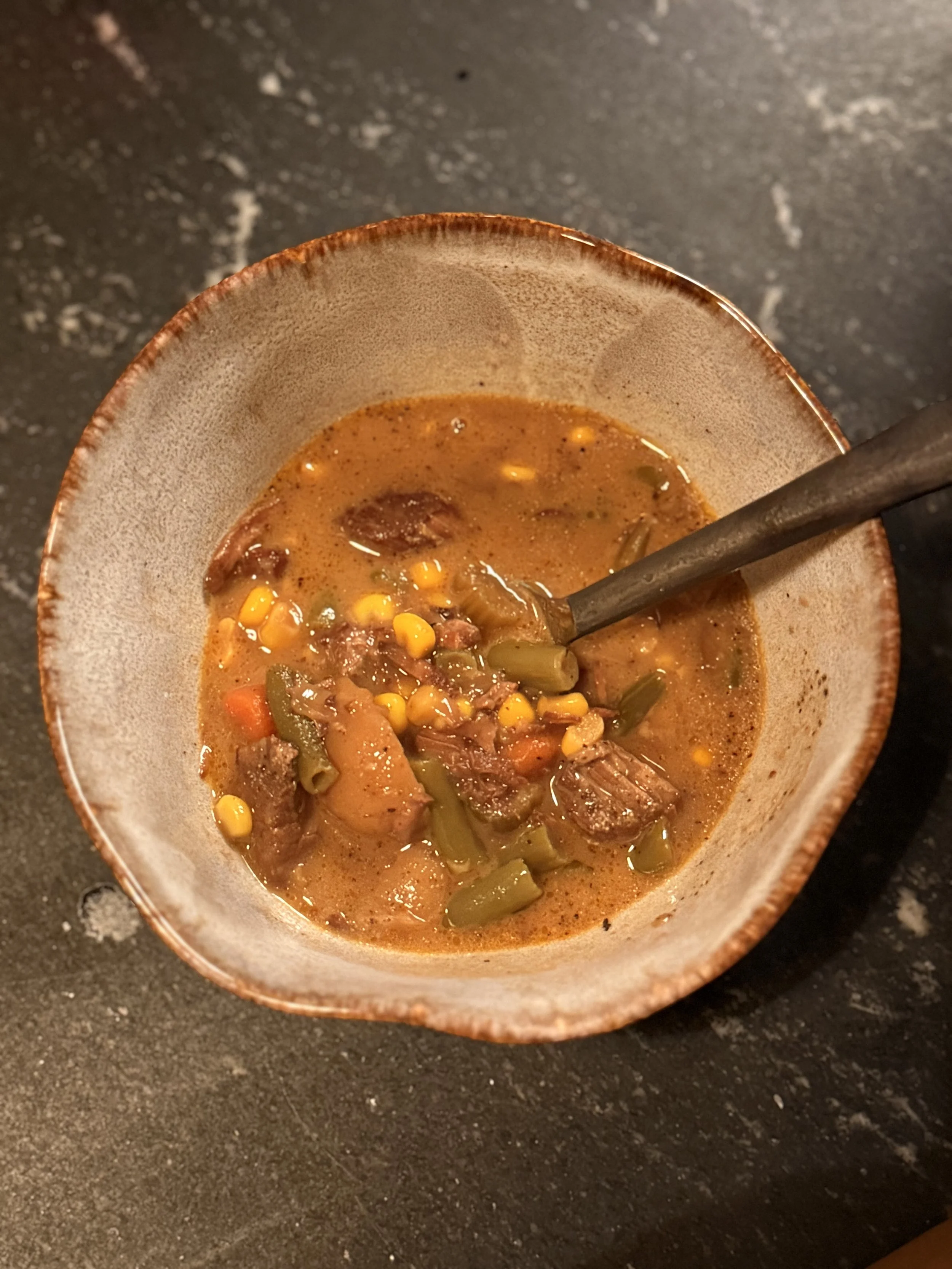 Add veggies and cream. About one hour before serving, stir in the peas, corn, and green beans. Then, in a small jar or bowl, mix ½ cup beef broth with 2 tablespoons of flour, shake or whisk until smooth, and pour it into the slow cooker along with the heavy whipping cream. Stir and let it cook for the final hour — it will thicken into a beautiful, creamy stew.
