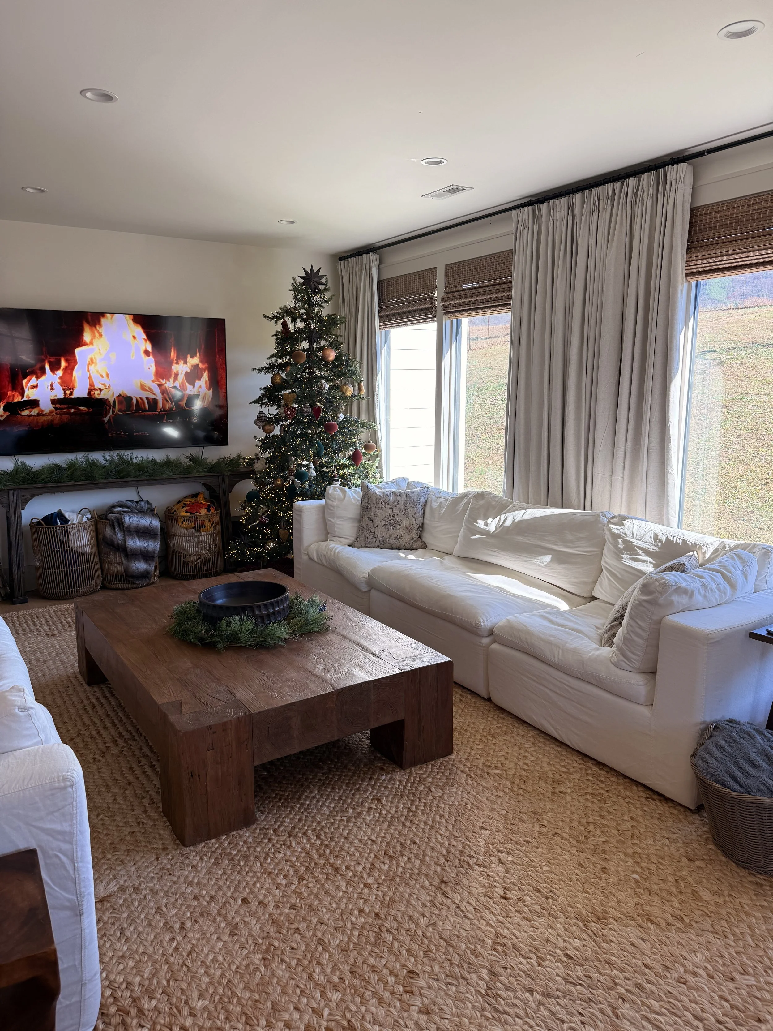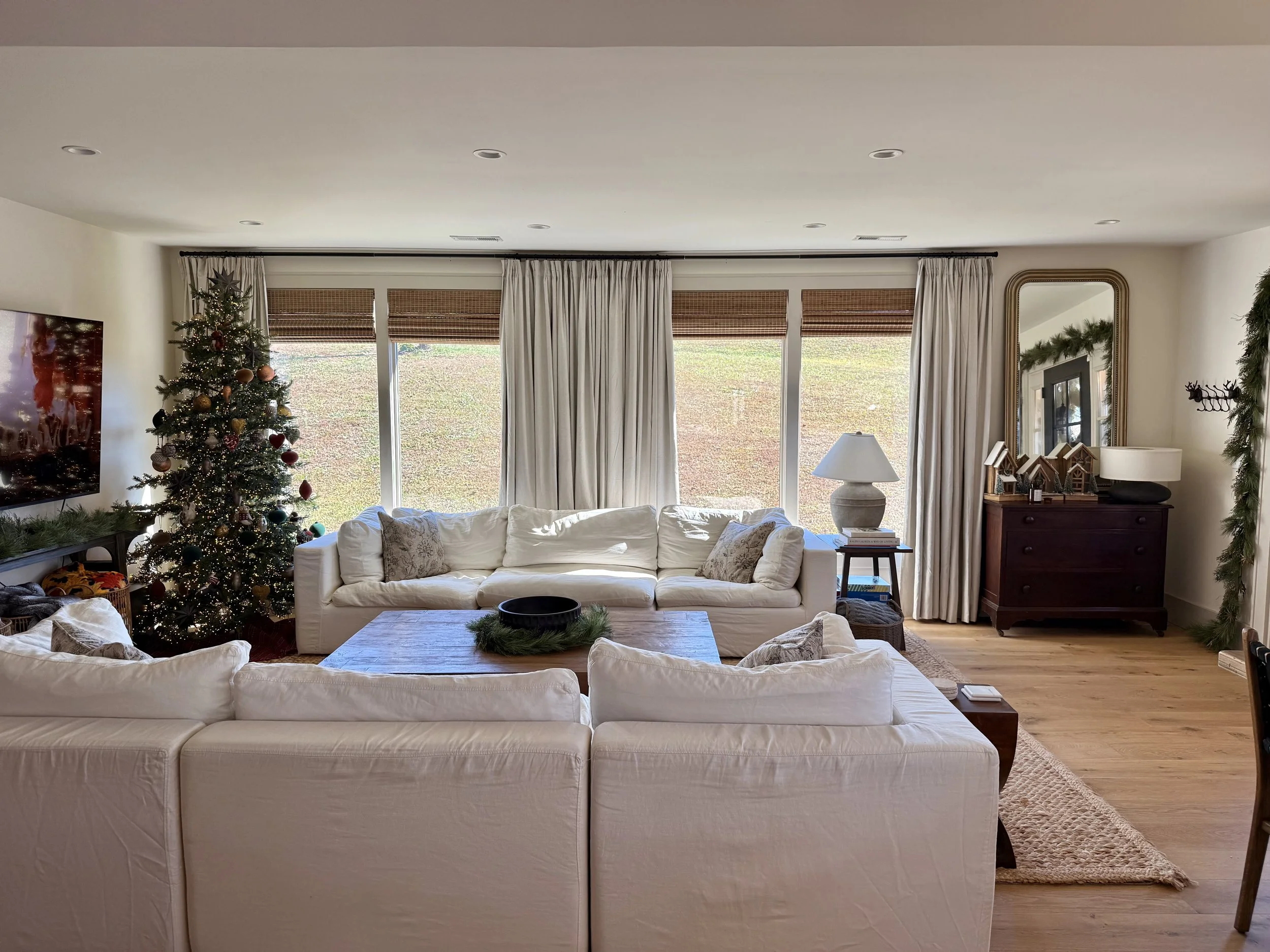 I love how the new linen blackout curtains in the living room completely change the feel of the room. It feels so much more finished and put together, don’t you think? Up next, we want to switch out our couches for some that are a little more comfortable. We love how big they are and how many people they fit, but want them to be a little more comfy and cozy to lay on.