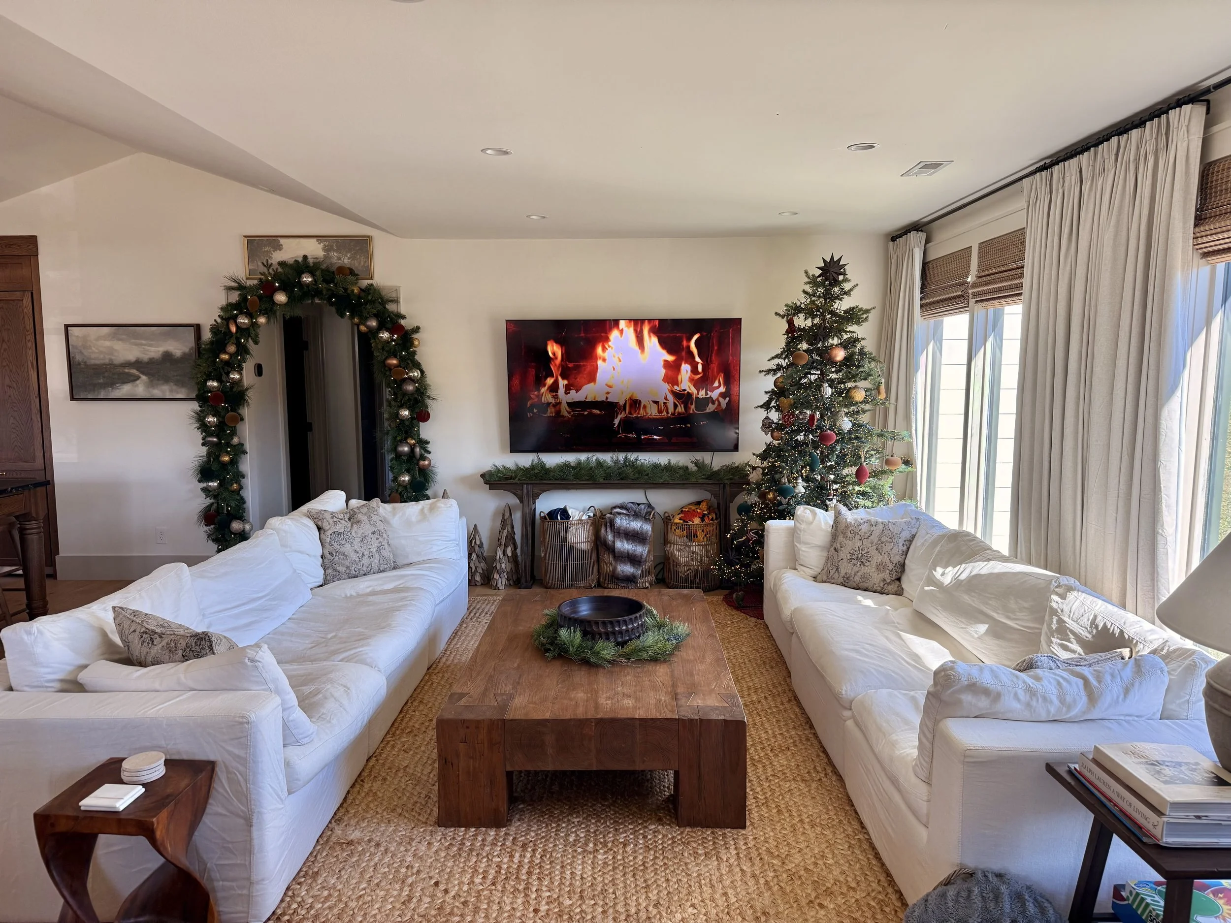 My favorite pieces of holiday decor are the pre-lit mixed green arches over the doorways. They make the whole room feel magical and extra holiday-ish. PJ decorated them with flocked ornaments and I think it makes them look even better.