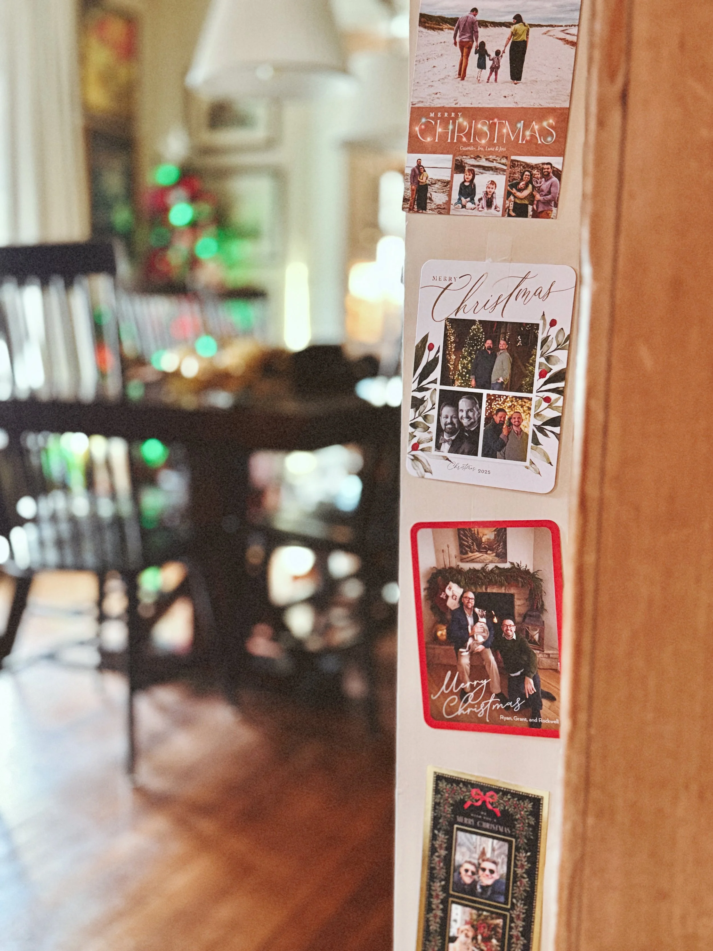 Growing up, we did the exact same thing but on the French doors that led into our dining room. Same spot, same ritual, same house. My mom would start with one card, then another, and before long the doors were completely framed. I remember standing there, reading every name, studying the handwriting, noticing which families used the same photo year after year. It felt ceremonial in a quiet way, like proof that we belonged to something bigger than just our four walls.