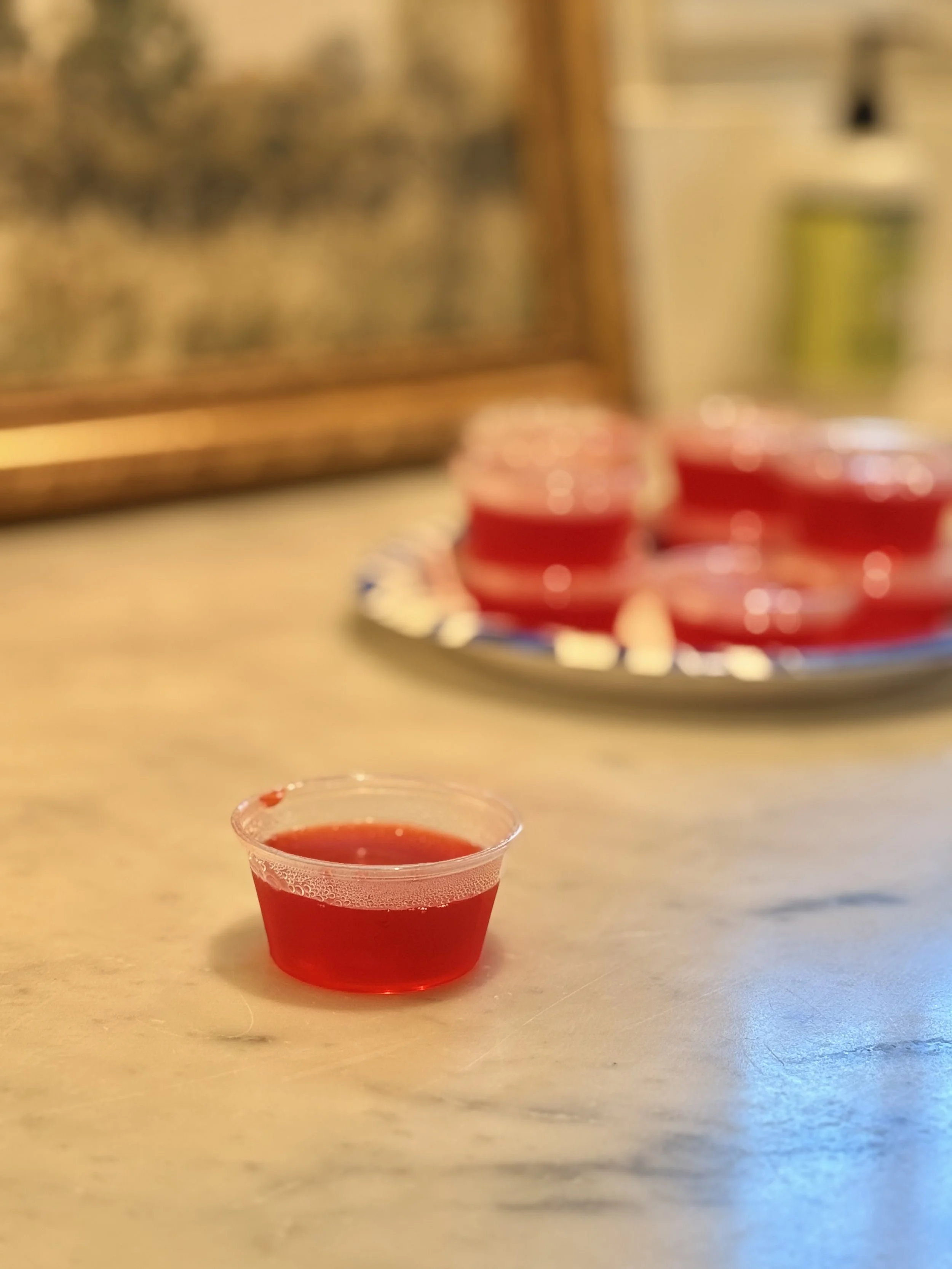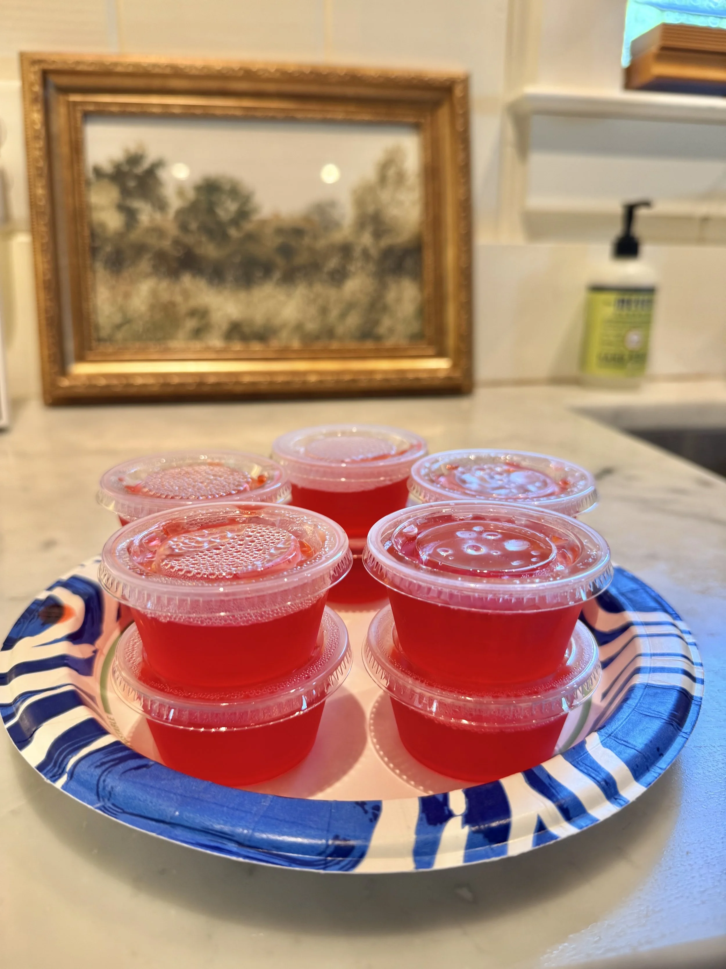 I had never made Jello shots before (though I have consumed quite a few in my time), but they’re super easy and extremely yummy. We used the strawberry flavored Jello, but you can, of course, use whatever your favorite flavor is.