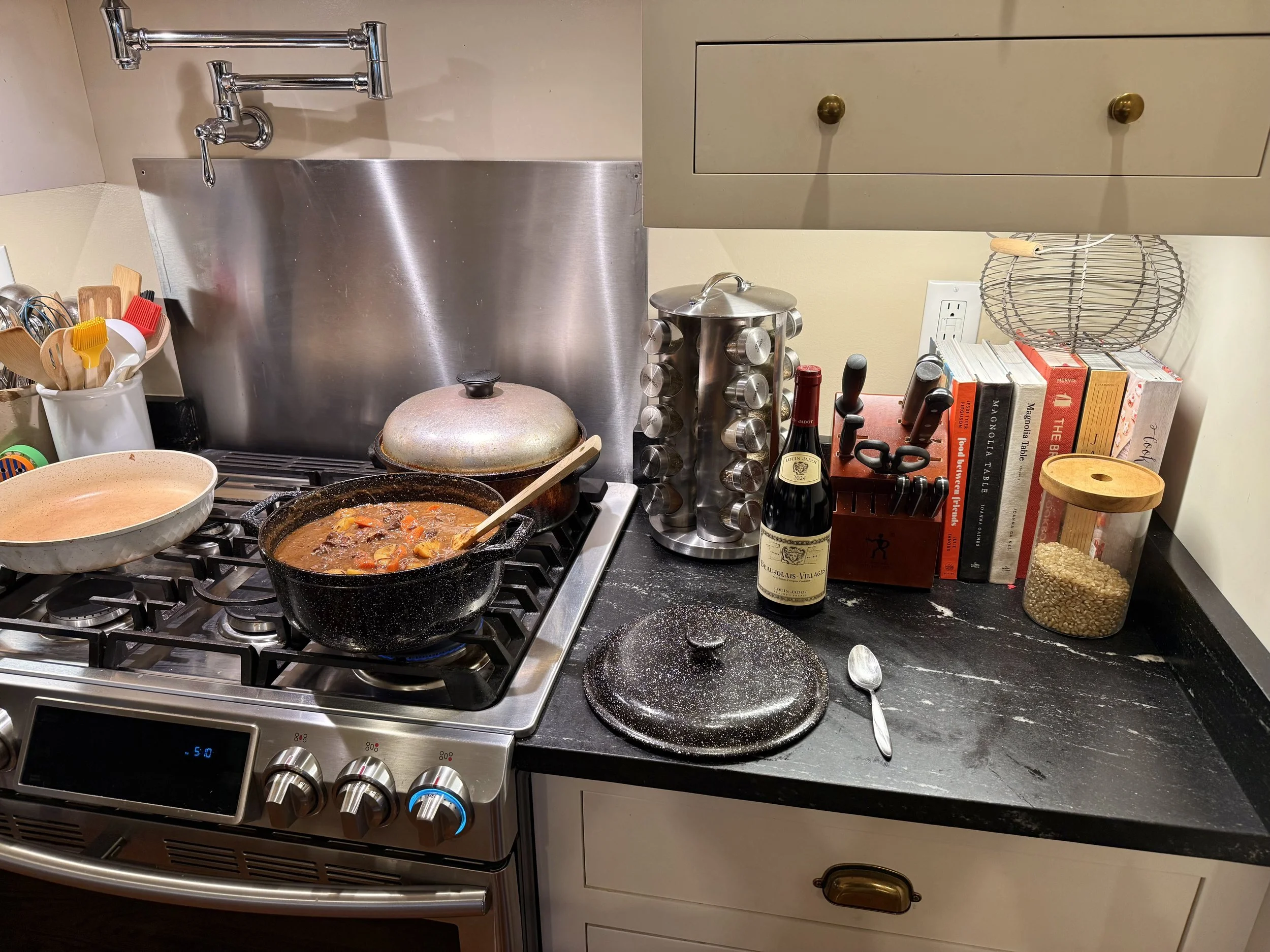 My sister-in-law stood at the stove stirring a pot of beef stew that smelled like it had been simmering all week. I bought the wine, because if I can’t braise, I can at least decant. The cork popped. Glasses clinked. My heart was full.