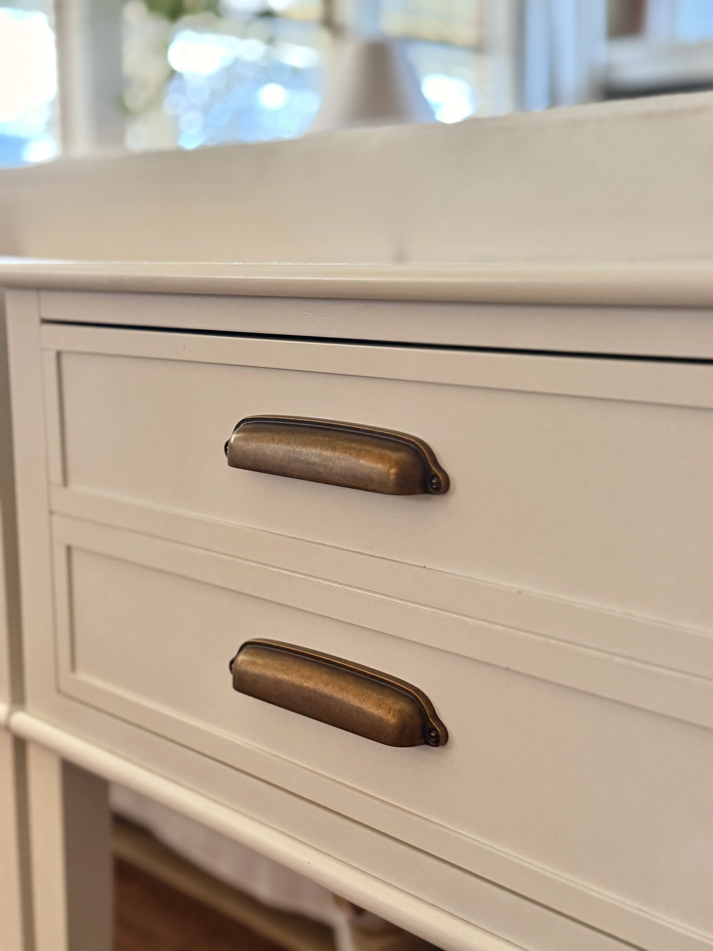 So PJ ordered a set of antique brass pulls (2 for $14!) online. Just simple pulls with that warm, slightly aged brass tone that always feels a little timeless.